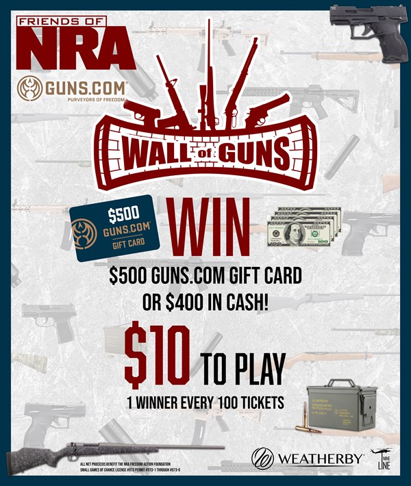 Attendees can visit Booth #39 near the Boat Hall to experience the Wall of Guns firsthand. New this year, for just $10, guests can enter for a chance to win either a $500 Guns.com gift card or $400 cash. Gift card winners can use their prize toward any item on the Guns.com website, a major upgrade from past years, when winners could only select a firearm from the Wall of Guns. With one winner drawn for every 100 tickets sold, the odds are in participants’ favor, and every ticket purchased directly supports The NRA Freedom Action Foundation.